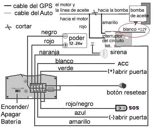 2. Para identificar y cortar la corriente o alimentación de bomba de combustible del vehículo, el cable ROJO se conecta con el motor, conecte el cable AMARILLO con la otra punta que ha quedado sola, (muy importante: debe usarse el relé anexo al equipo)